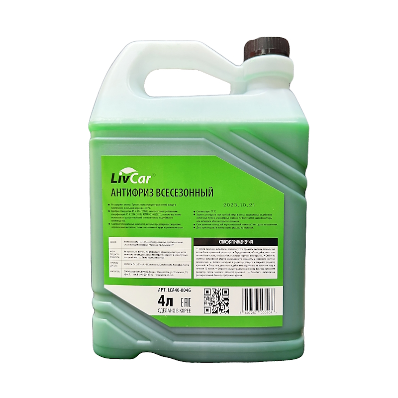 LIVCAR COOLANT -40°С (Зелёный), 4л — профессиональная готовая охлаждающая жидкость нового поколения для защиты системы охлаждения автомобиля в экстремальных условиях.