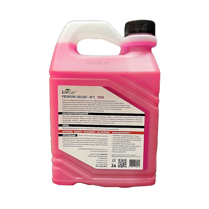 LIVCAR PREMIUM COOLANT -40°С (Розовый), 2л — премиальная охлаждающая жидкость премиум-класса для надёжной защиты системы охлаждения автомобиля в любых условиях эксплуатации.